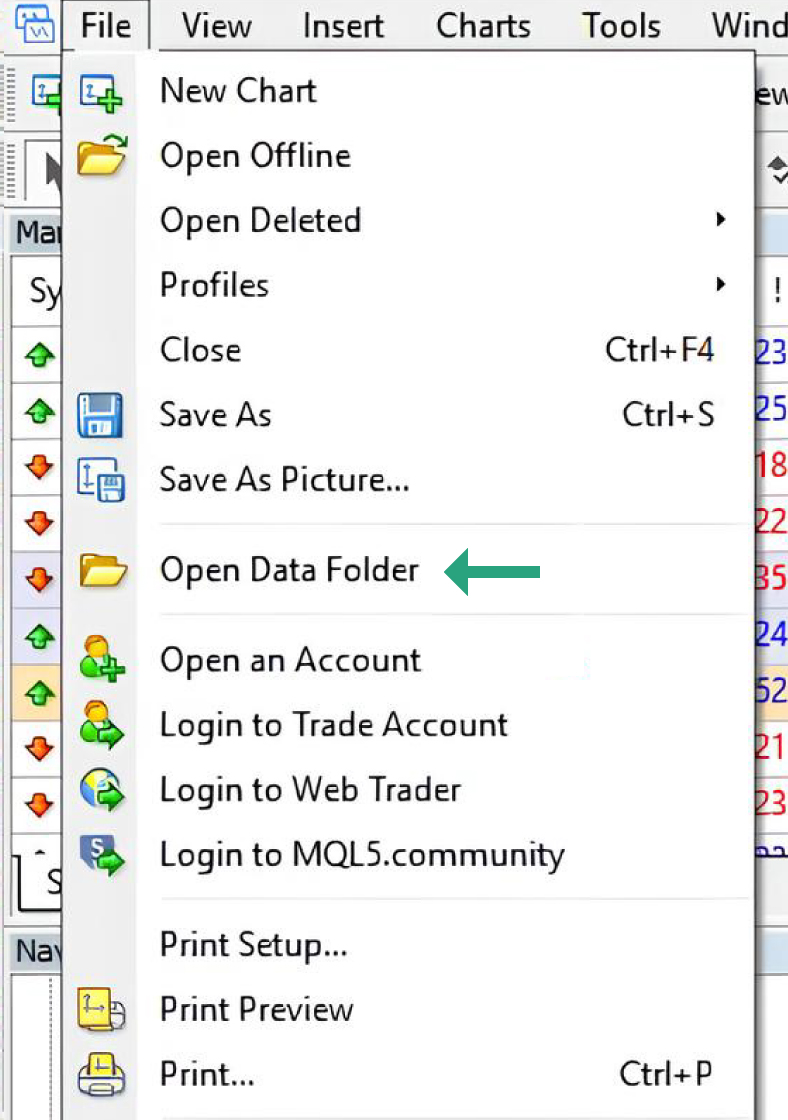 Select ‘Open Data Folder’ through the File in MT4.