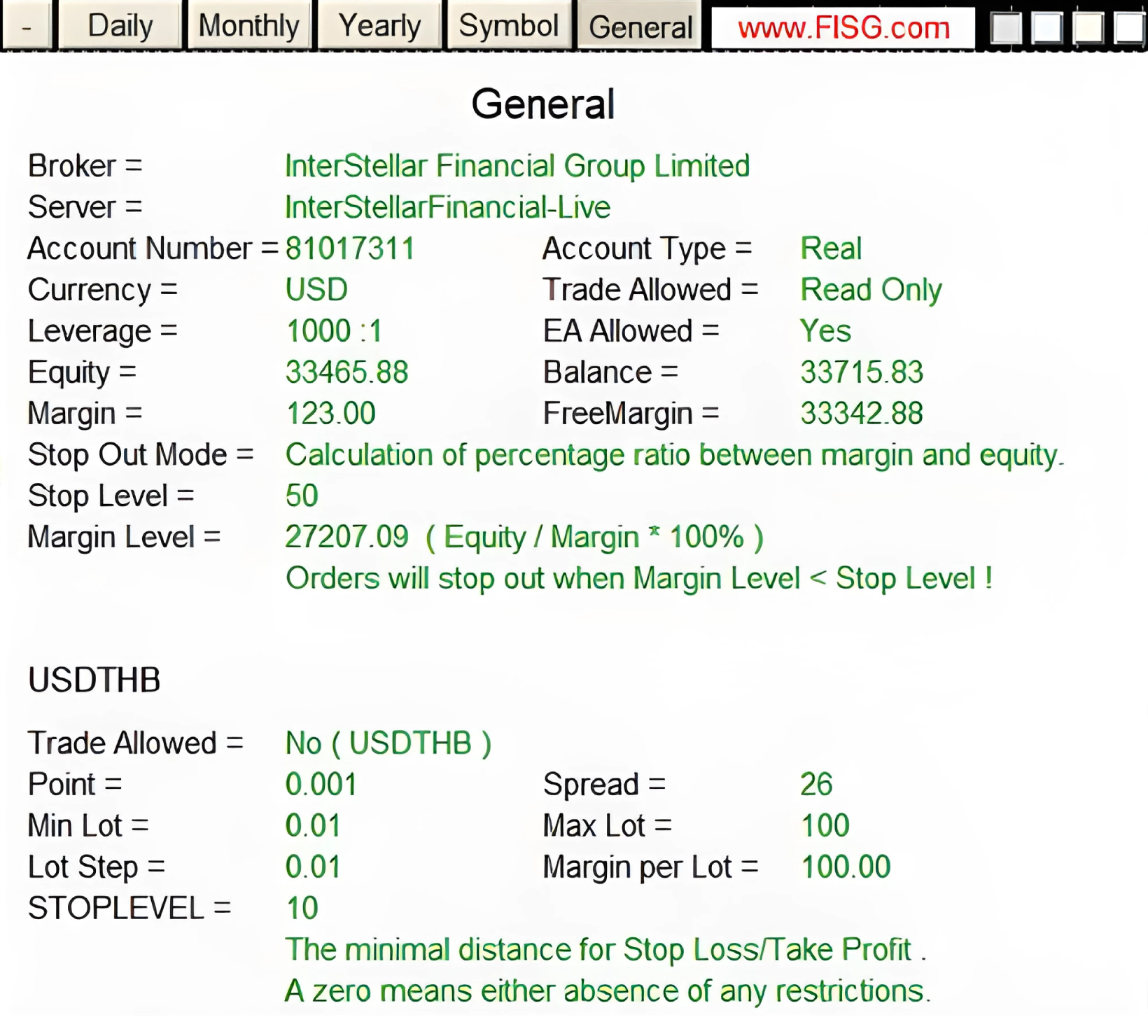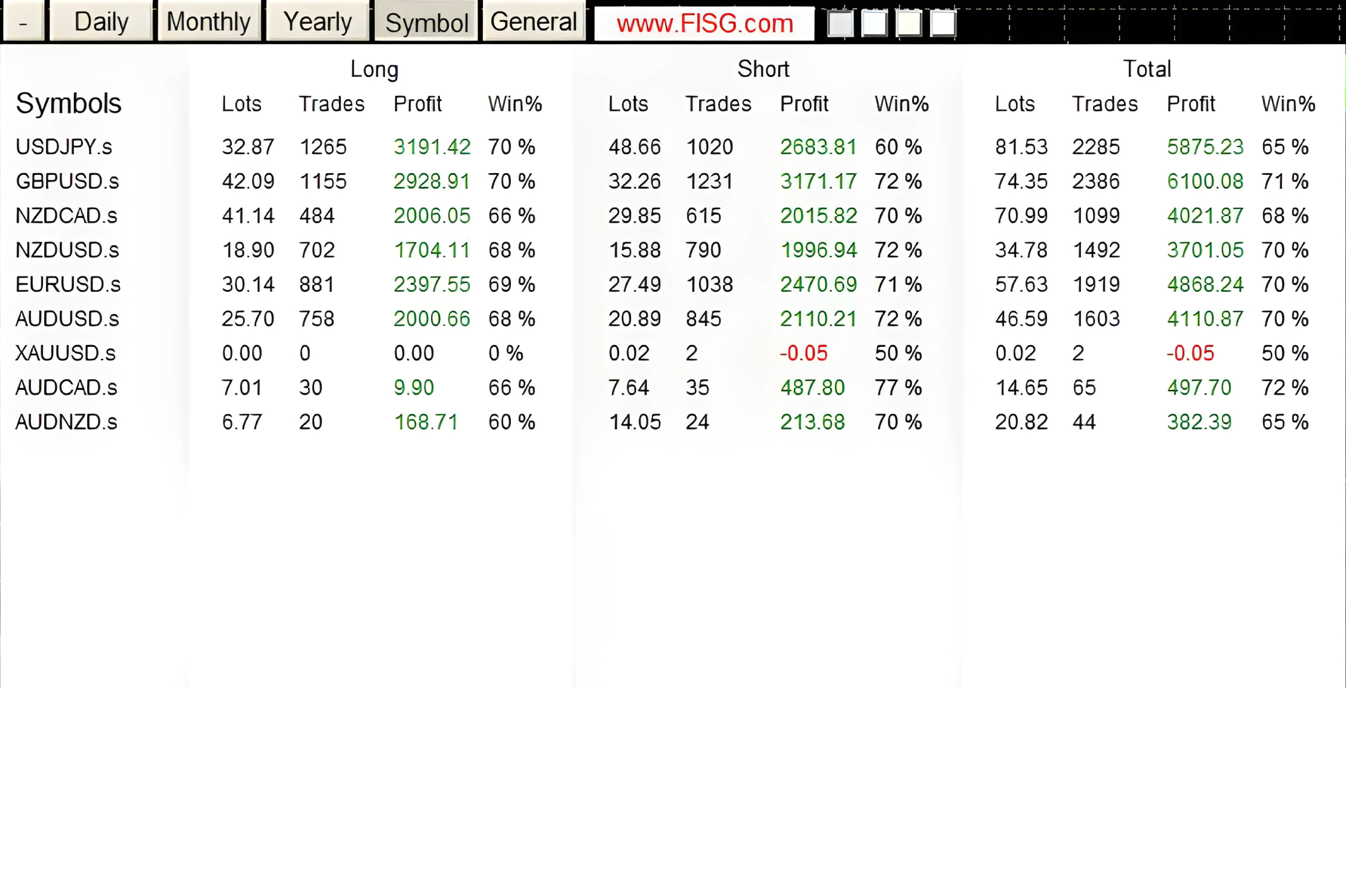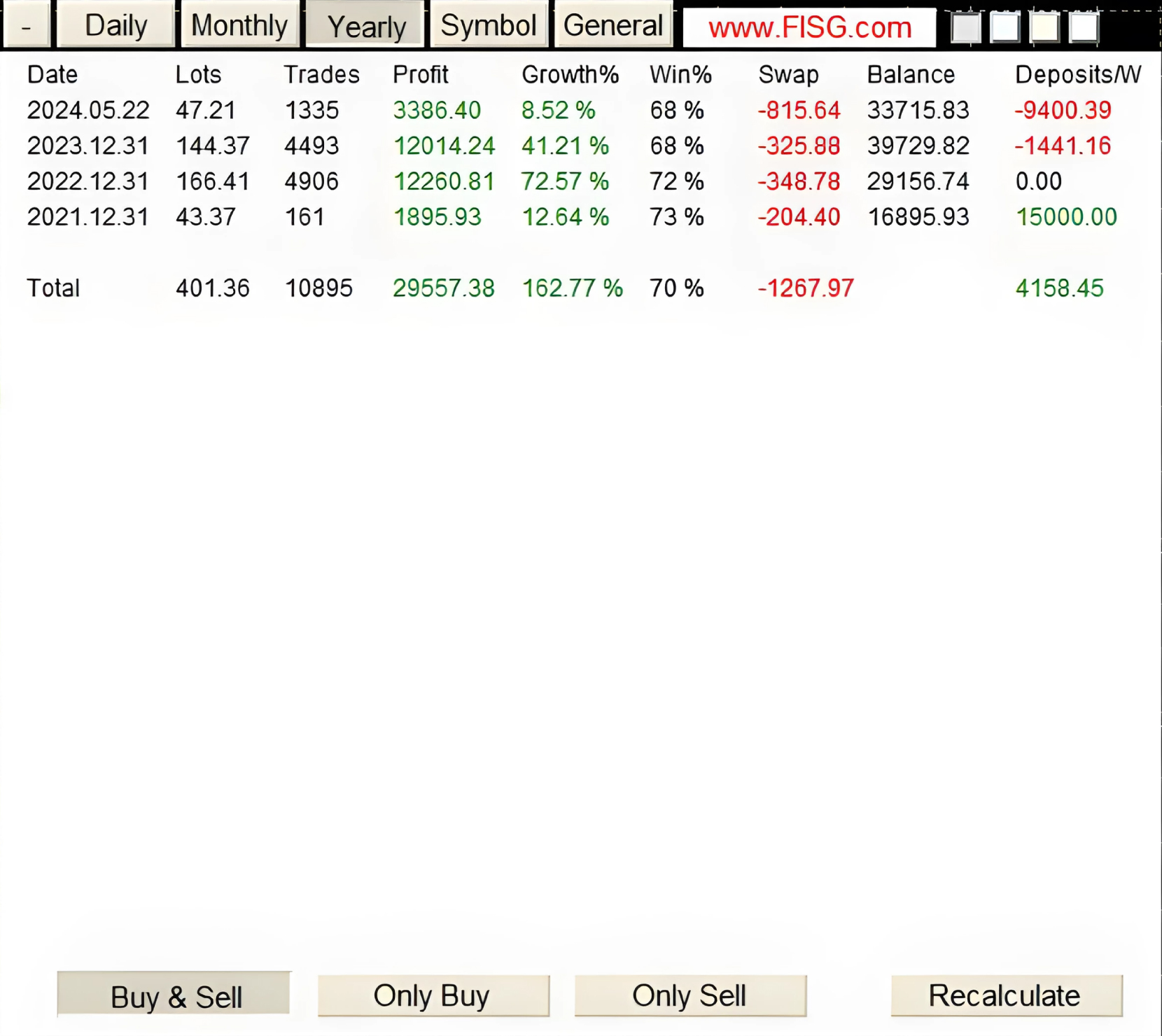 The following pages are loaded onto the chart, displaying the content in a clear and straight forward manner, presenting statistical data in a chart format, including daily, monthly, and annual statistics on date, lots, profit, and growth among other aspects.